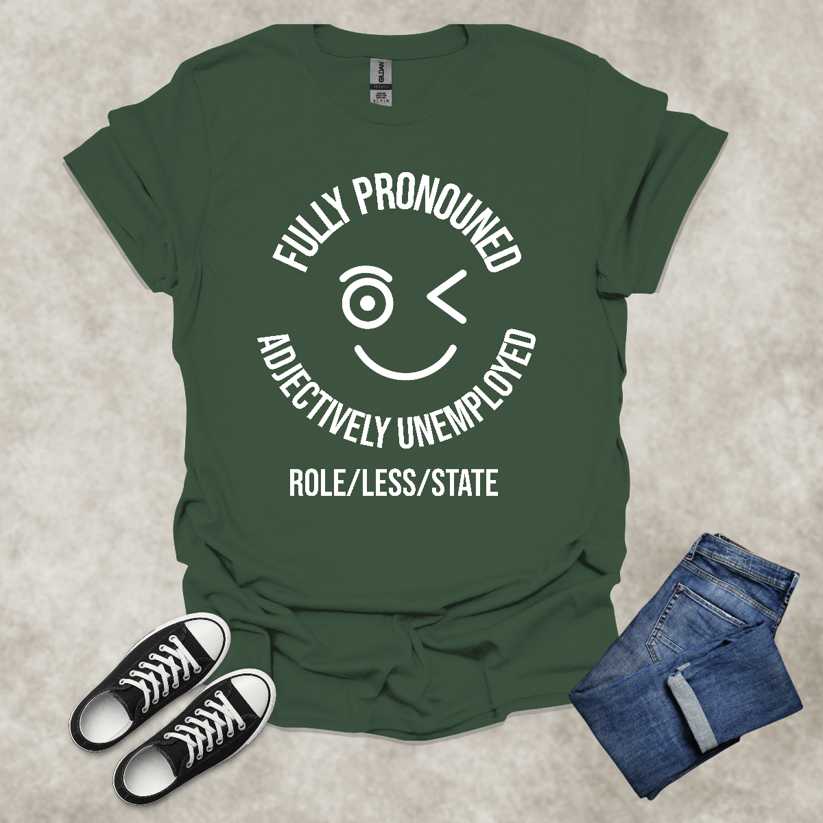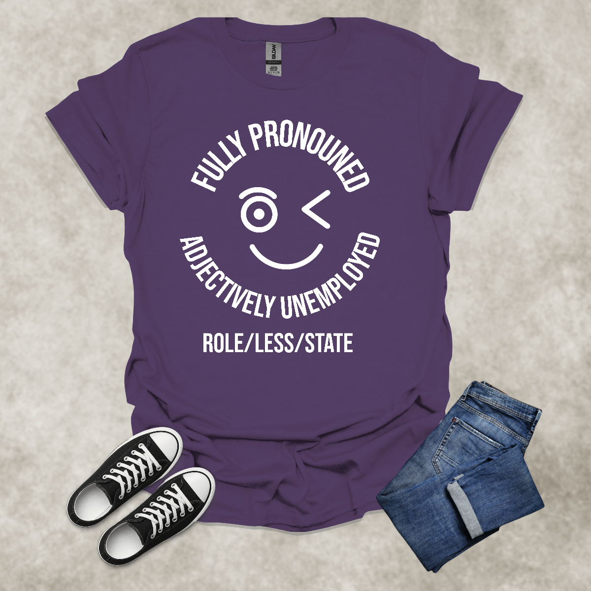 FULLY PRONOUNED: ADJECTIVELY UNEMPLOYED: ROLE/LESS/STATE — Corporate Satire Tee: Unisex Softstyle T-Shirt