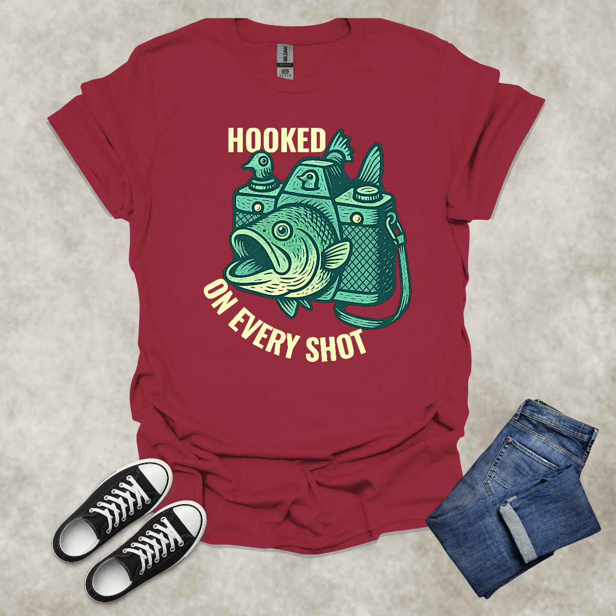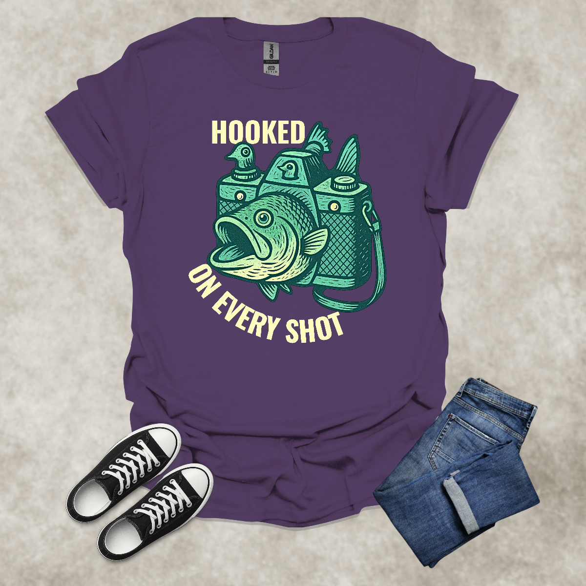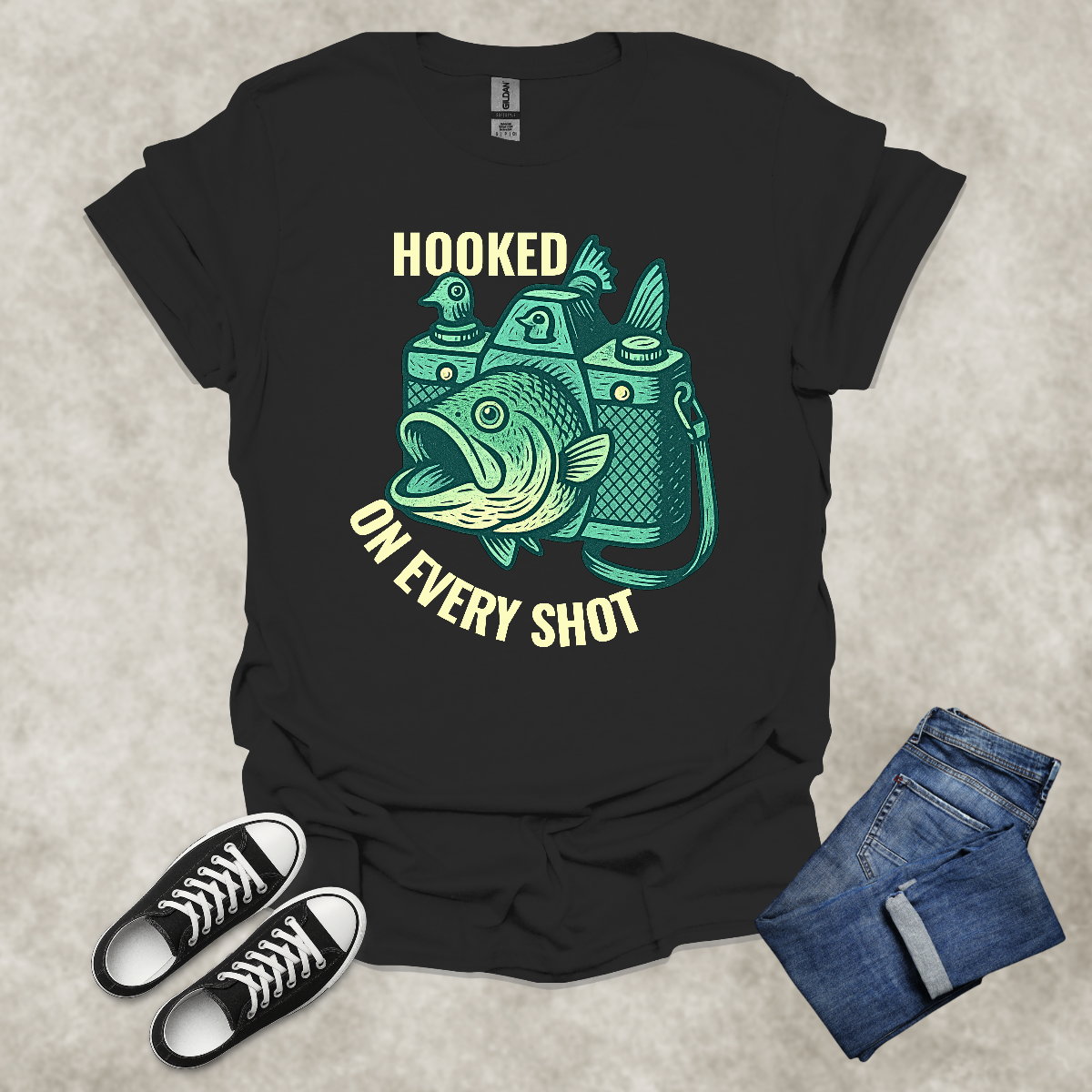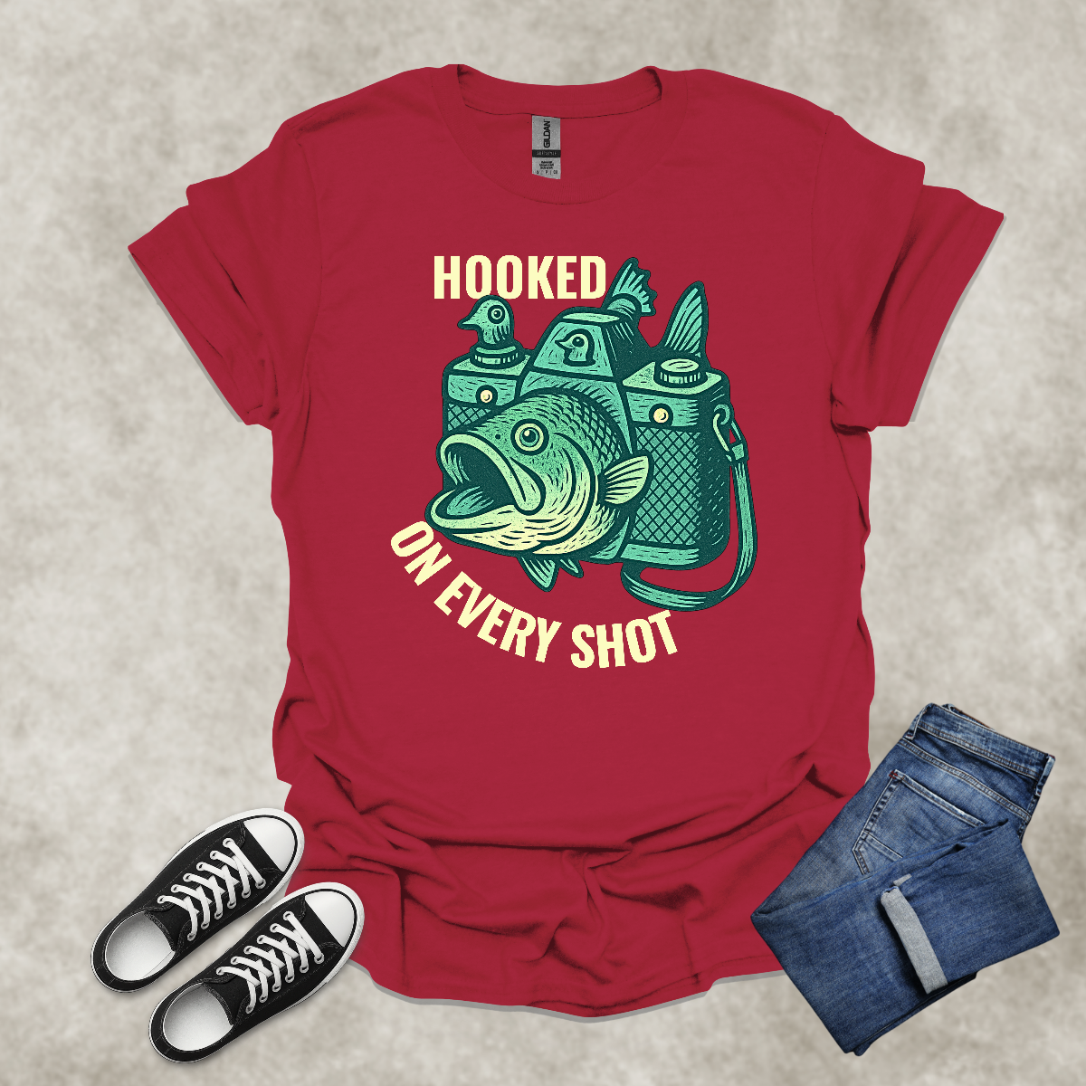 HOOKED ON EVERY SHOT — Fishing Photography Humor Tee: Unisex Softstyle T-Shirt