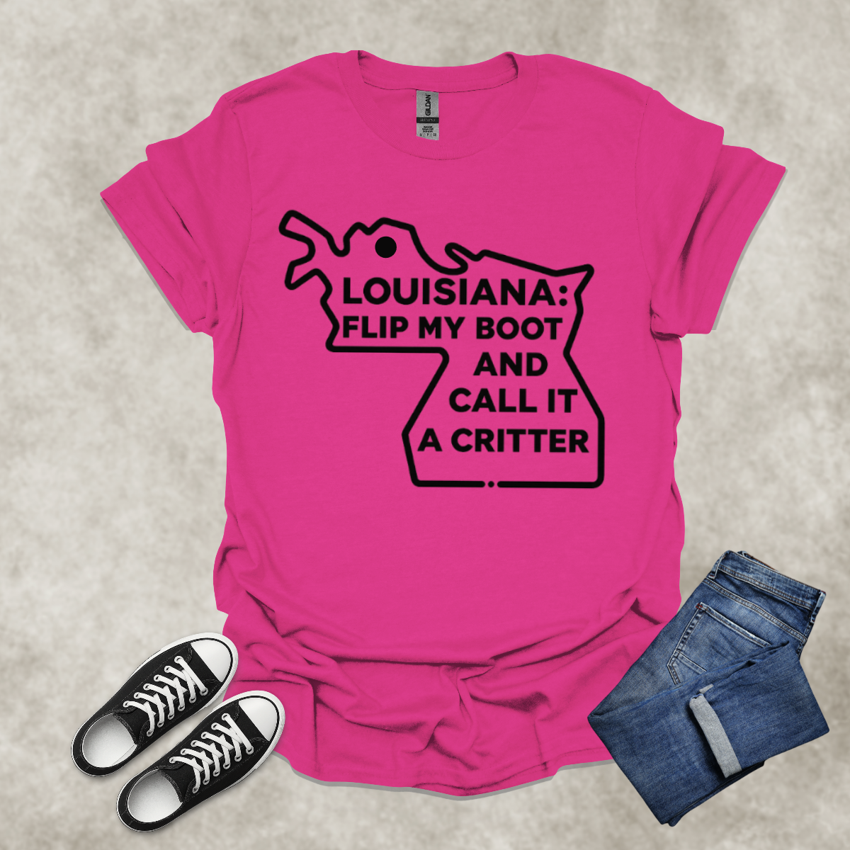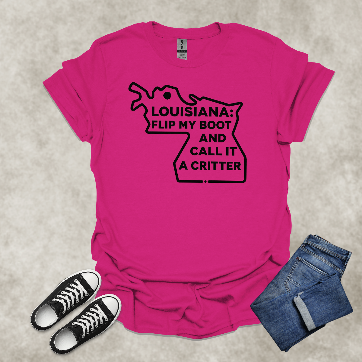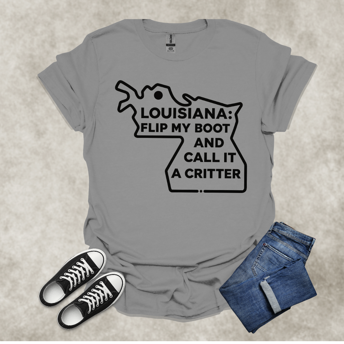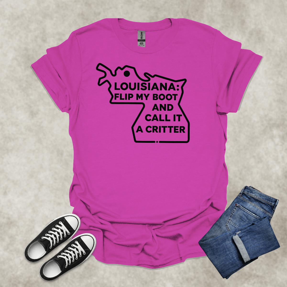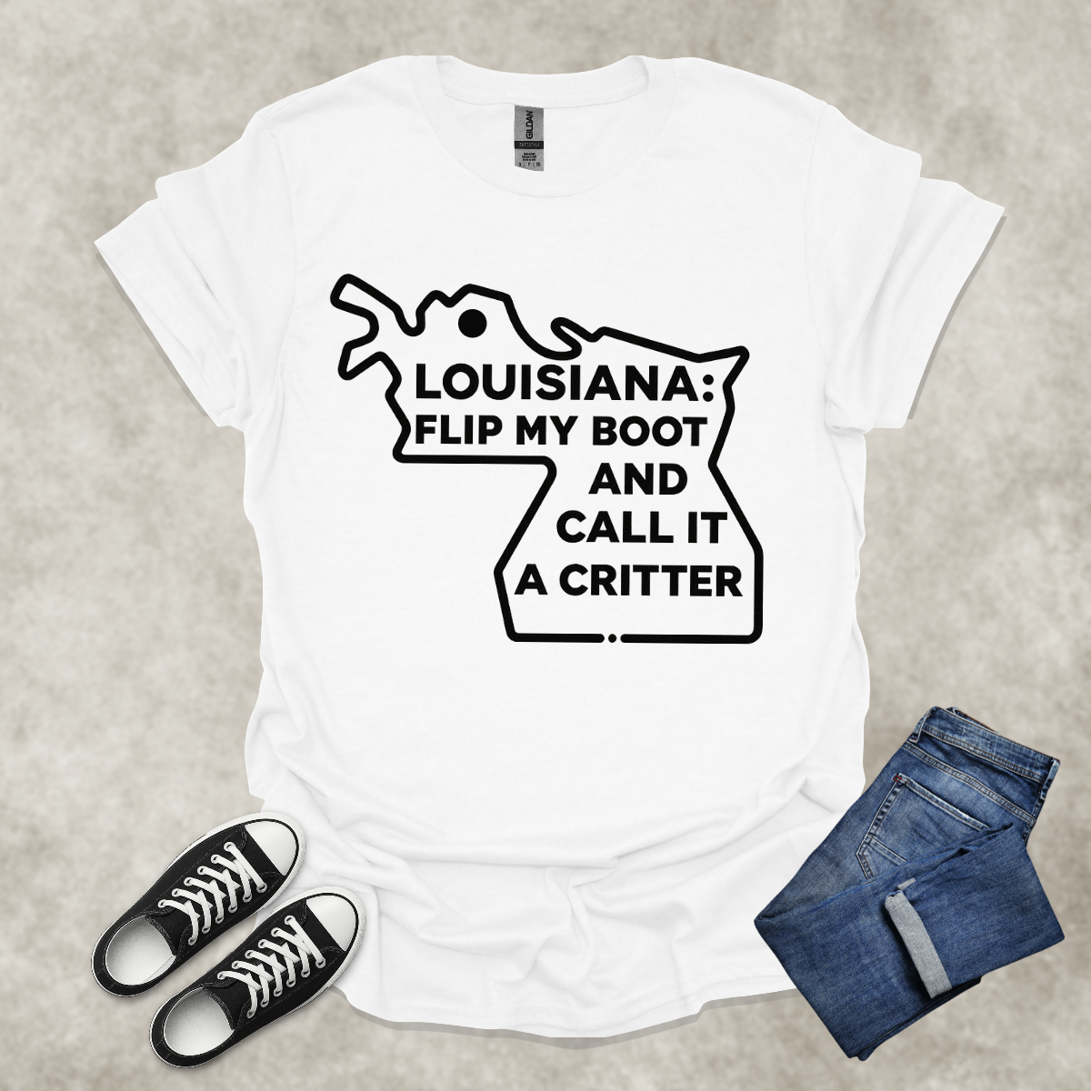 LOUISIANA: FLIP MY BOOT AND CALL IT A CRITTER — Cajun Humor Graphic Tee: Unisex Softstyle T-Shirt
