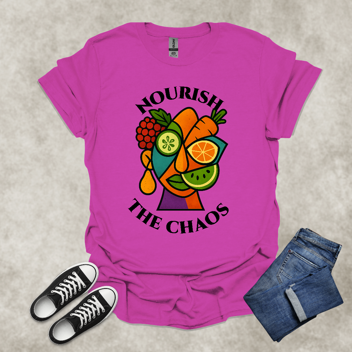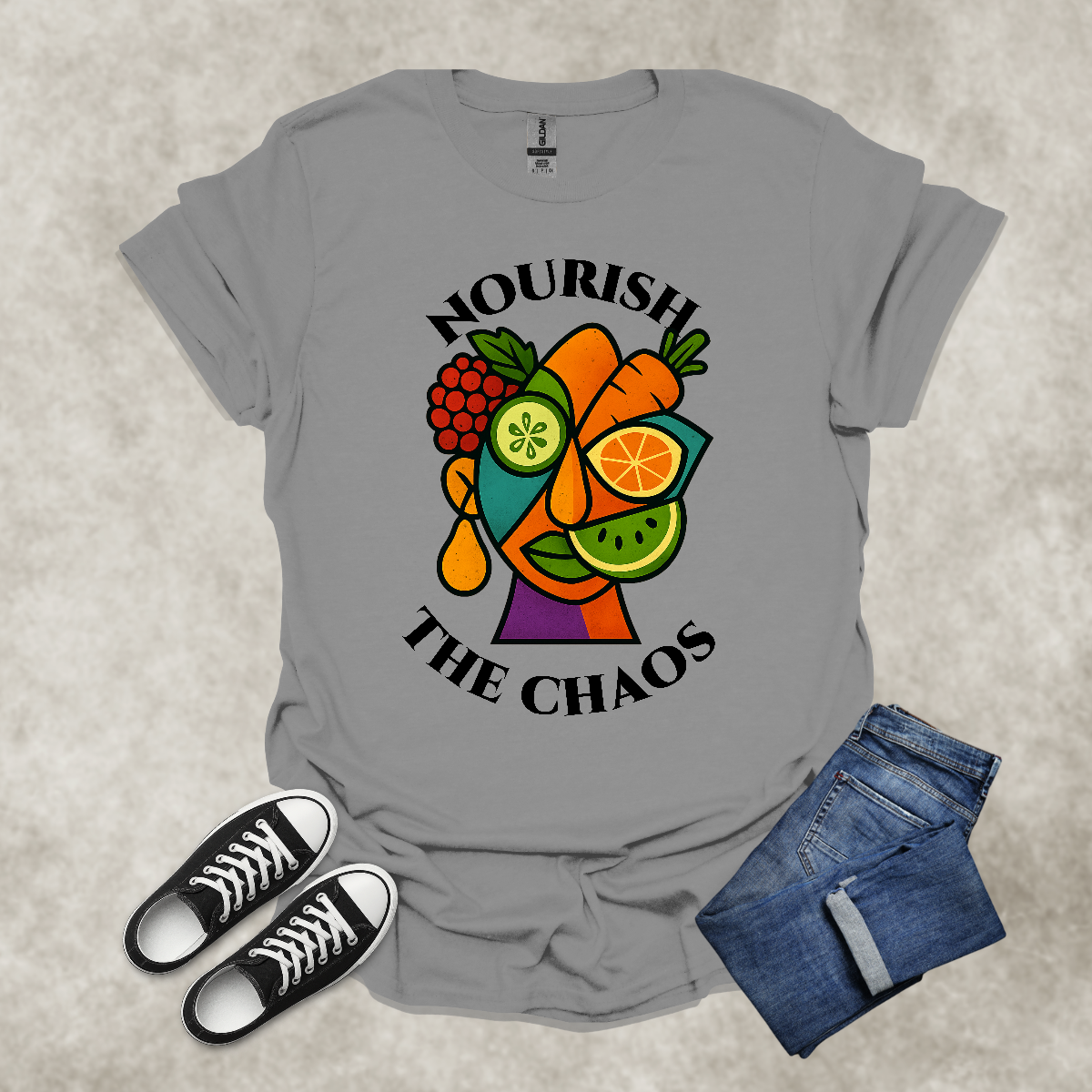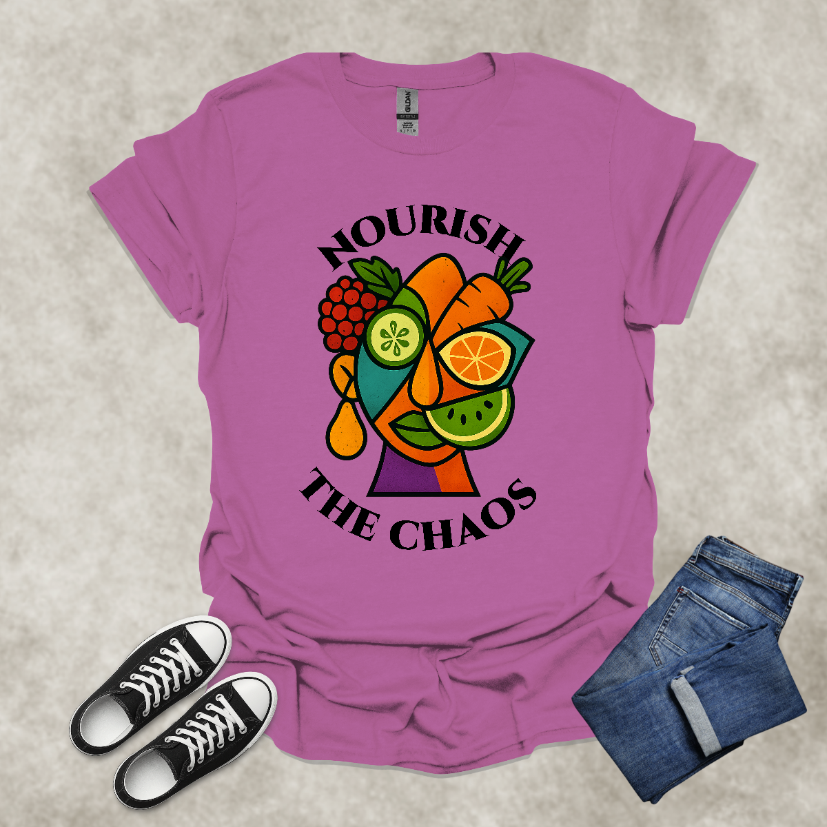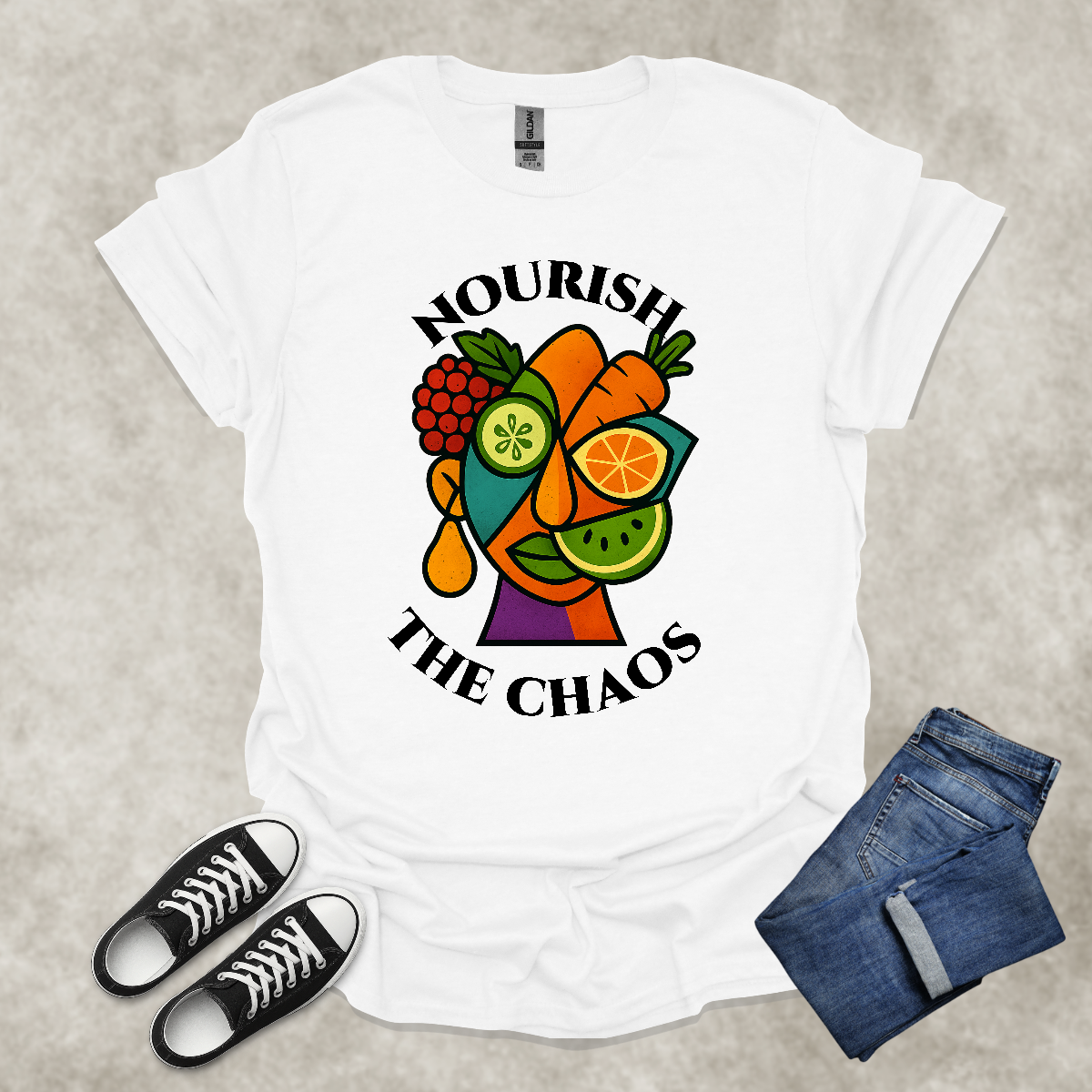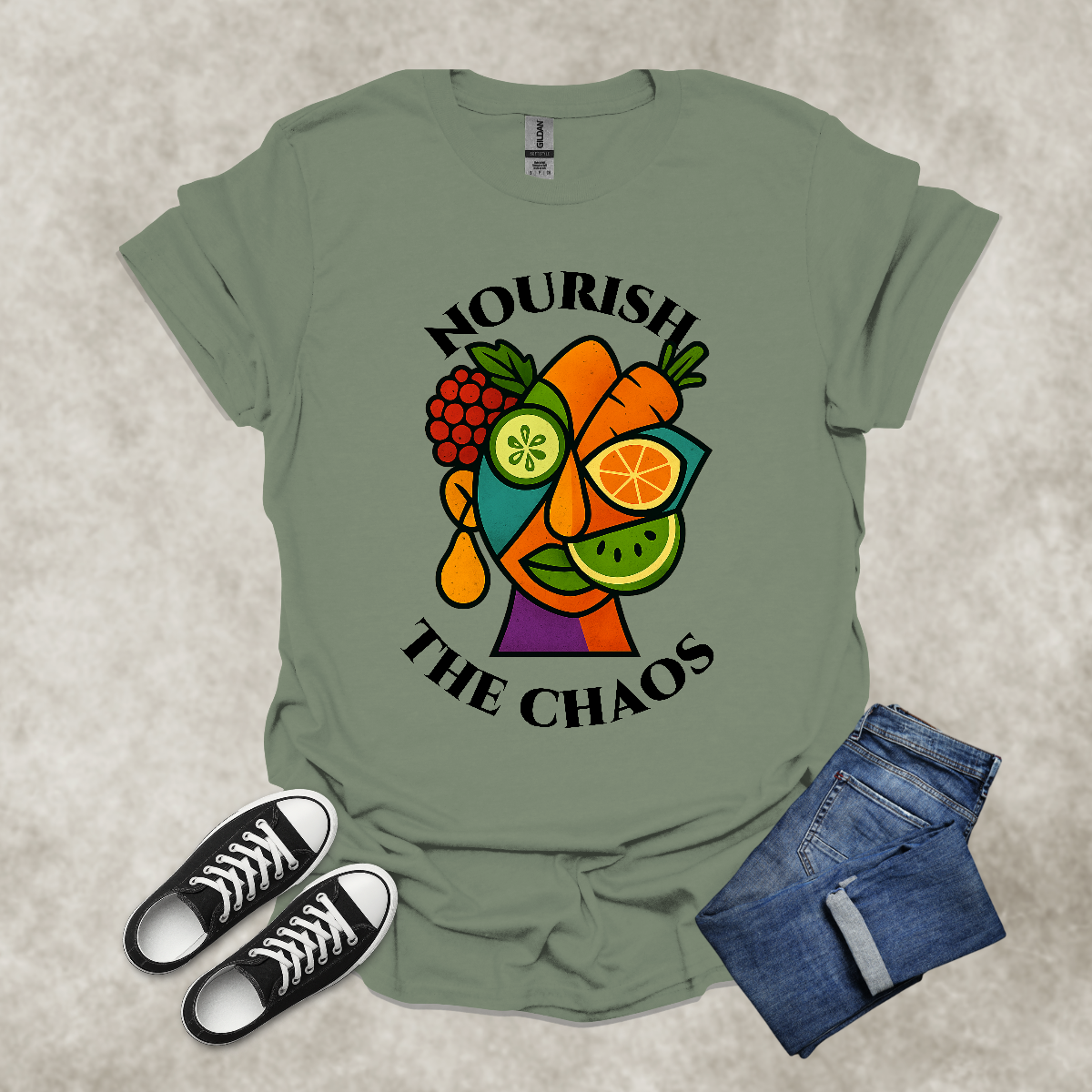 NOURISH THE CHAOS — Abstract Veggie Art Tee: Unisex Softstyle T-Shirt