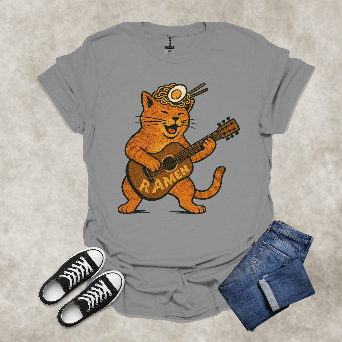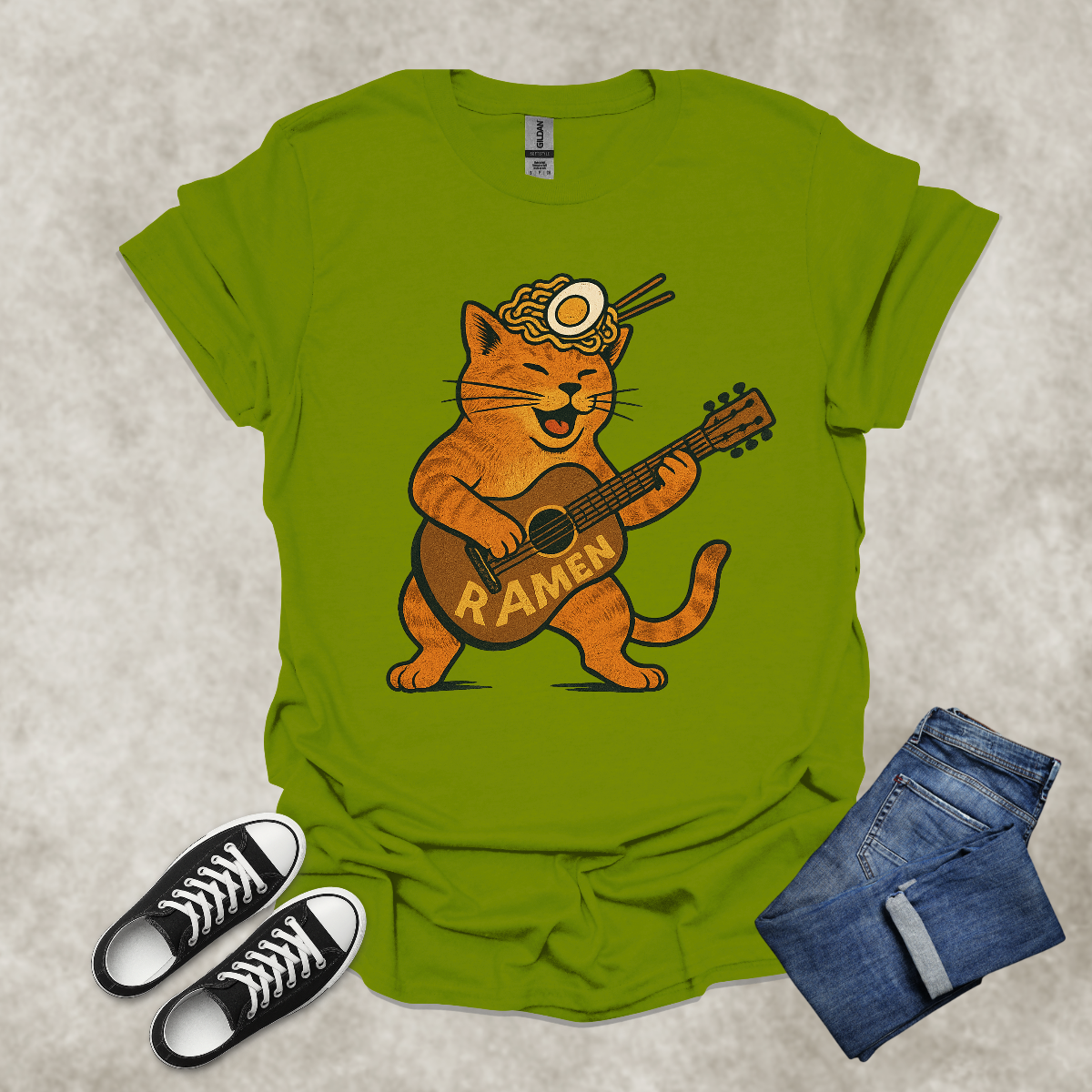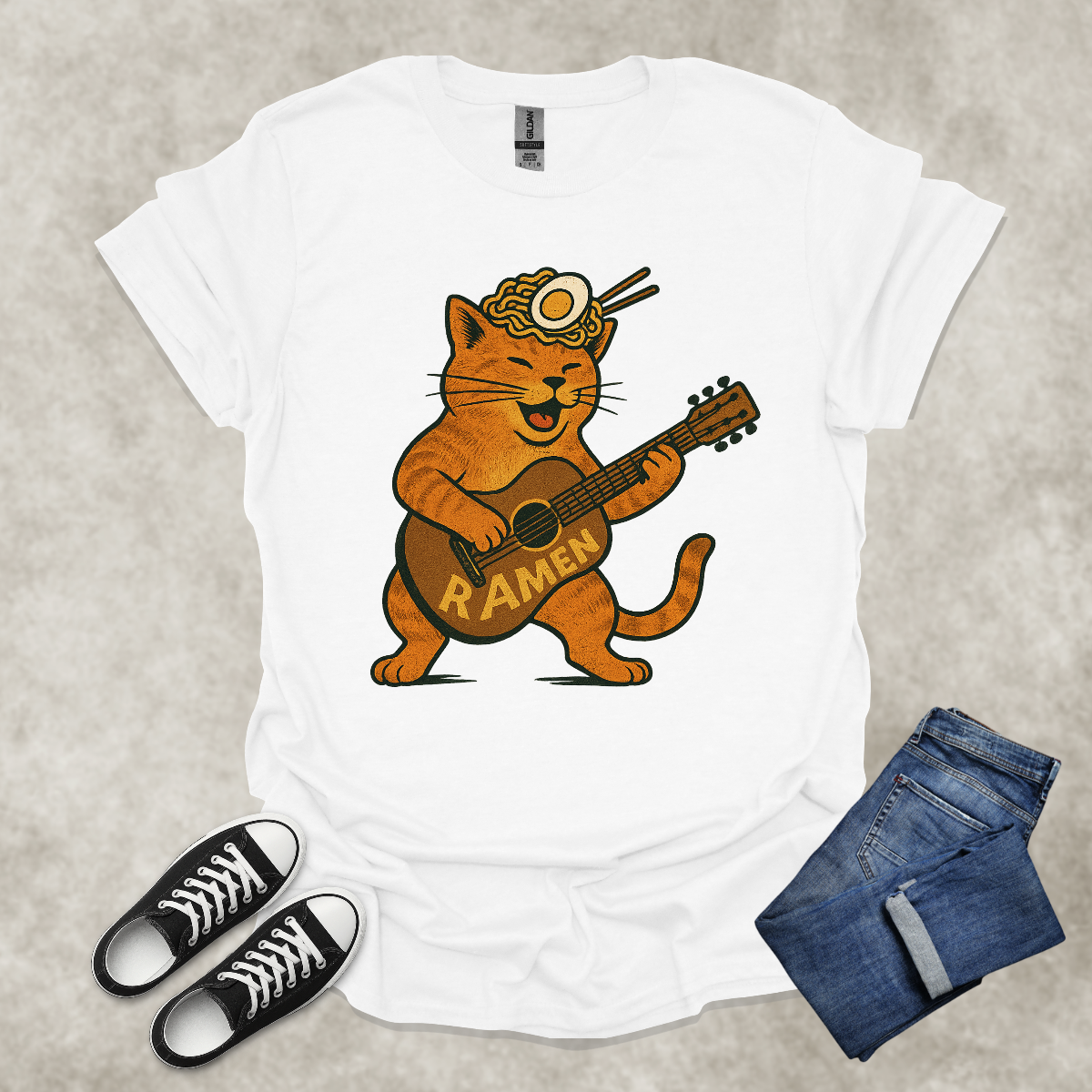 RAMEN GUITARIST CAT — Food & Music Satire Tee: Unisex Softstyle T-Shirt