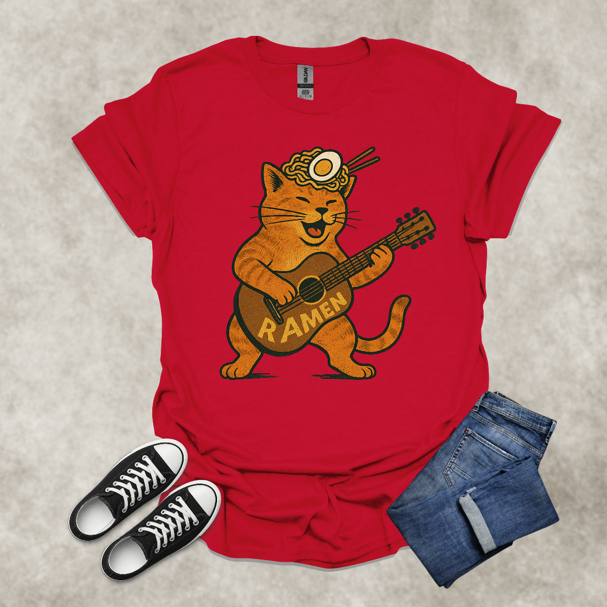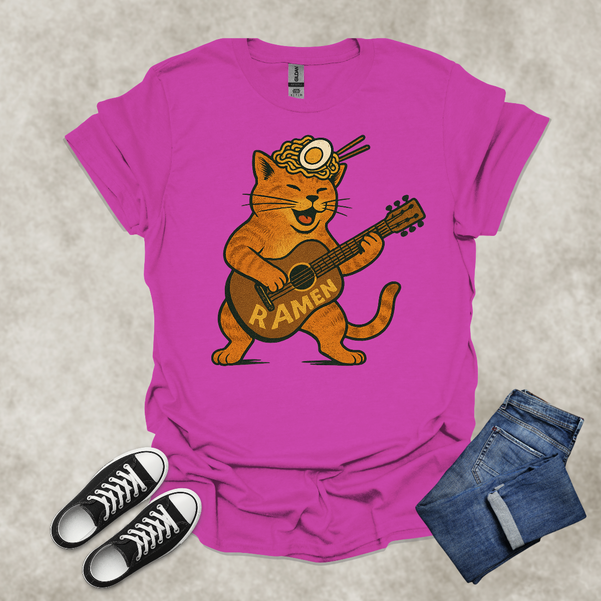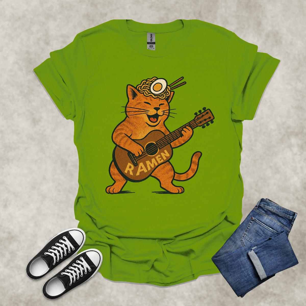 RAMEN GUITARIST CAT — Food & Music Satire Tee: Unisex Softstyle T-Shirt