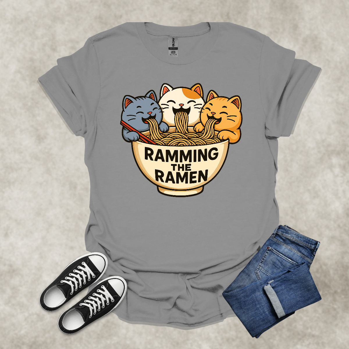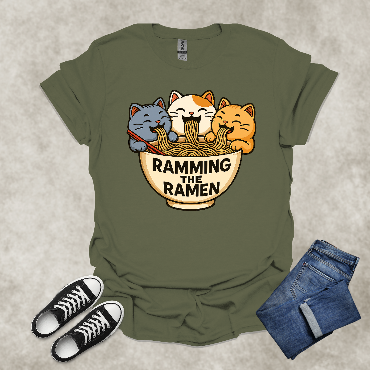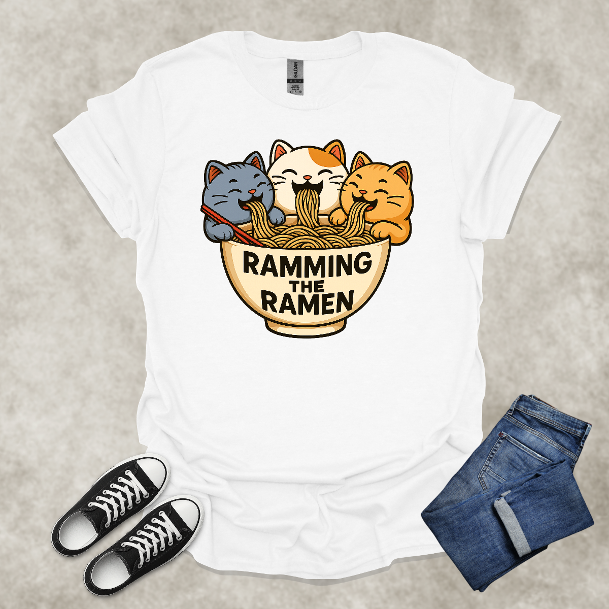 RAMMING THE RAMEN — Food & Cat Humor Tee: Unisex Softstyle T-Shirt