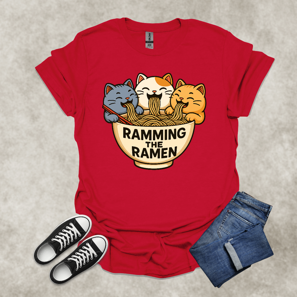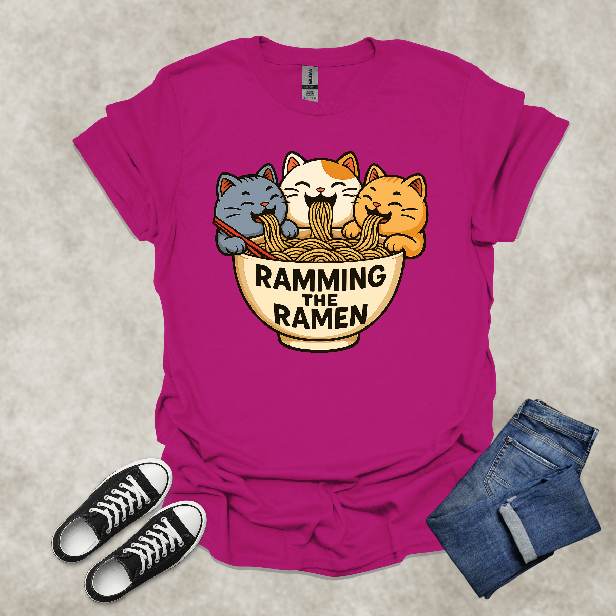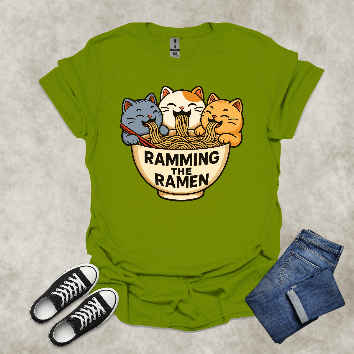 RAMMING THE RAMEN — Food & Cat Humor Tee: Unisex Softstyle T-Shirt