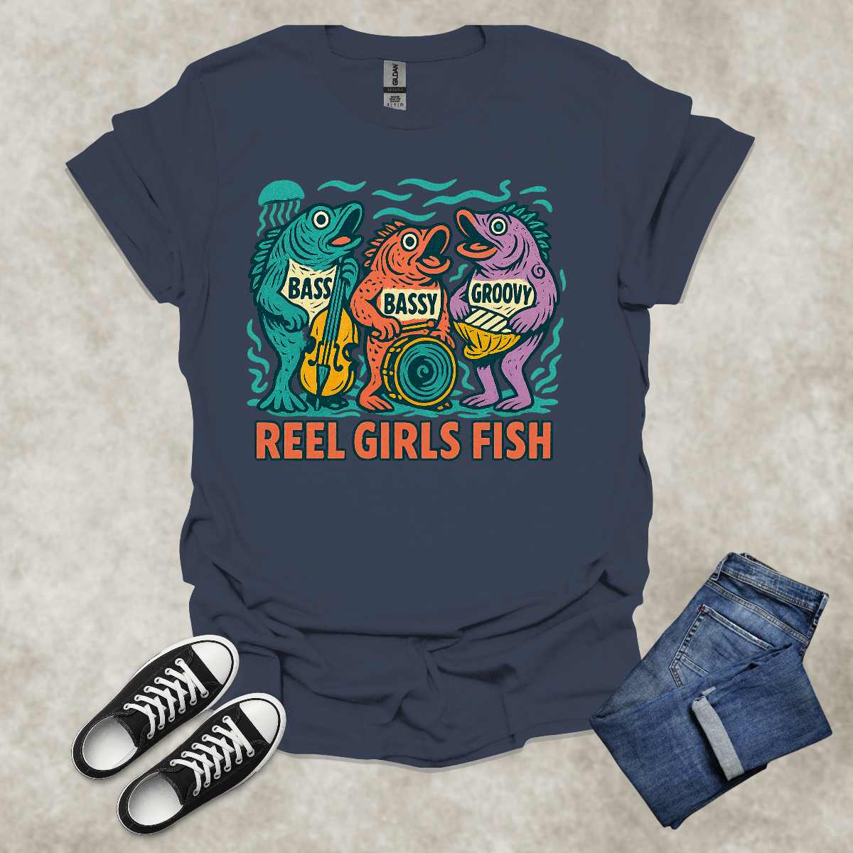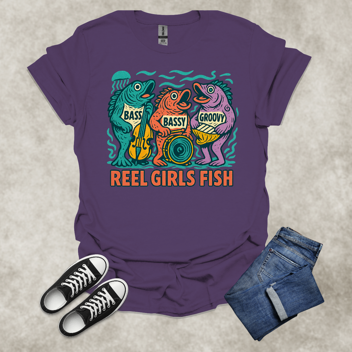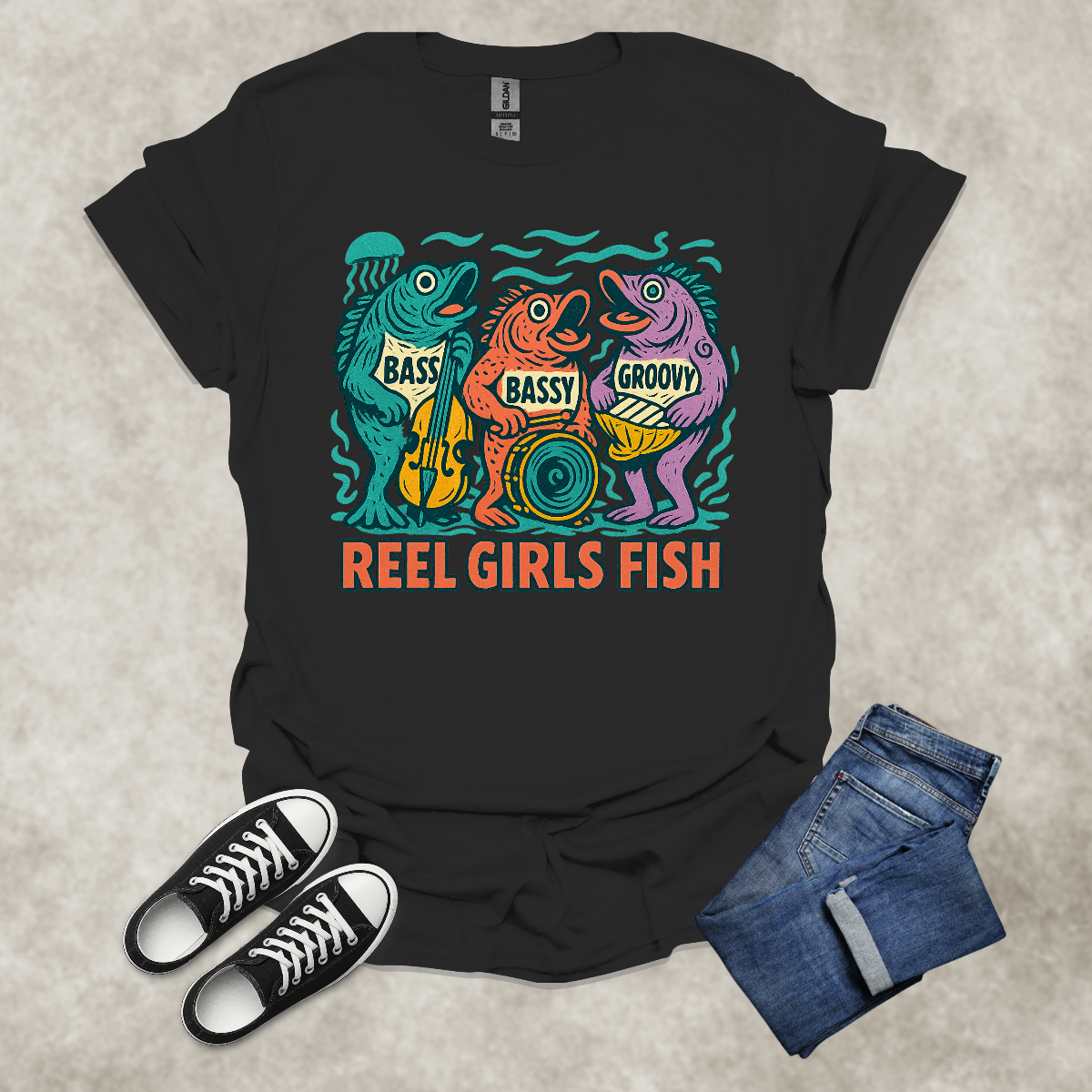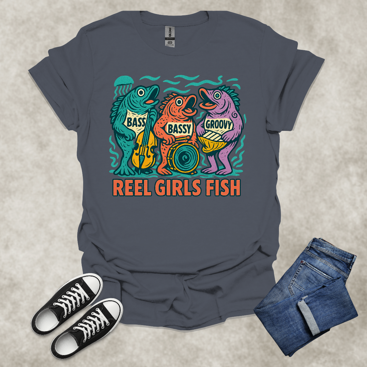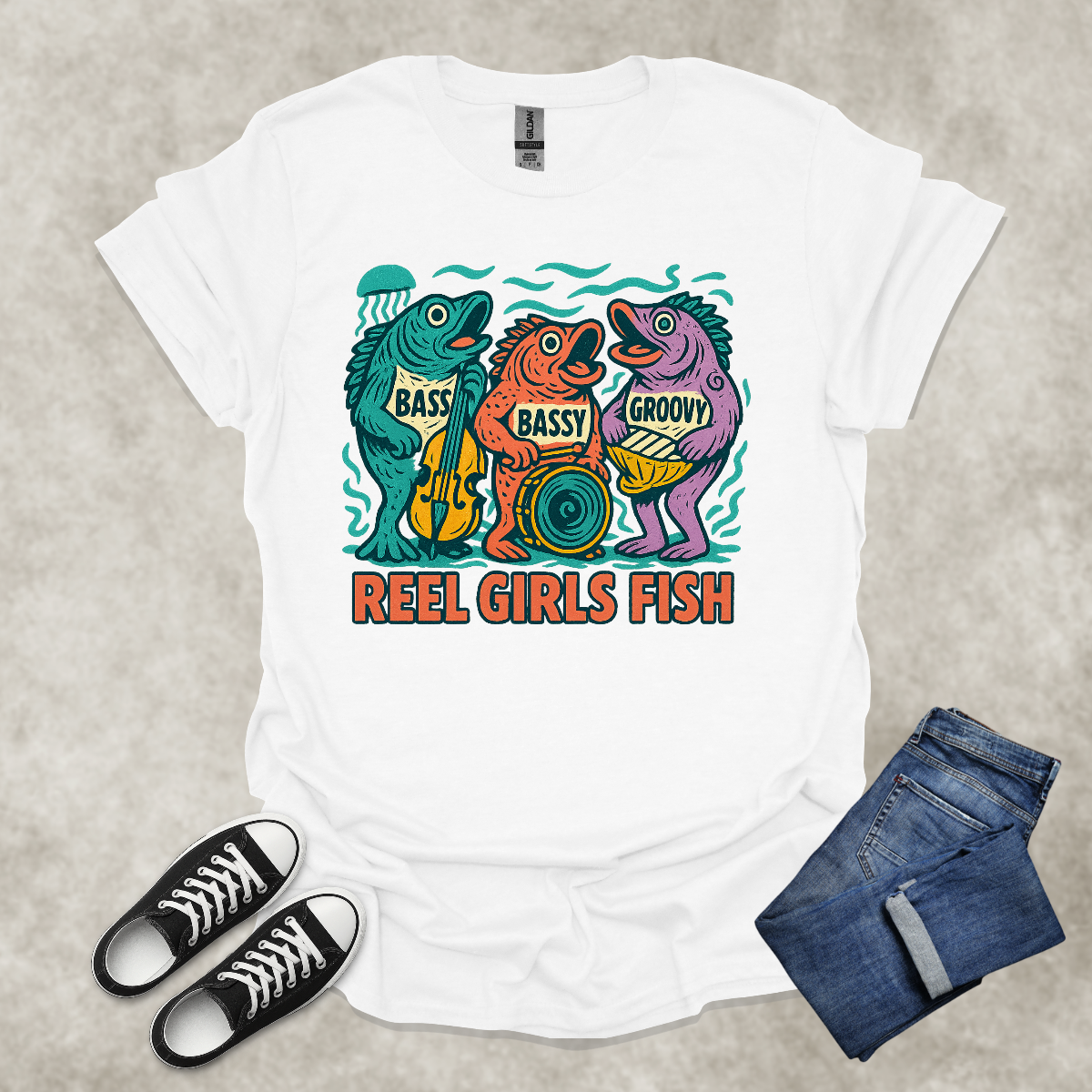 REEL GIRLS FISH — Fishing & Music Humor Tee: Unisex Softstyle T-Shirt